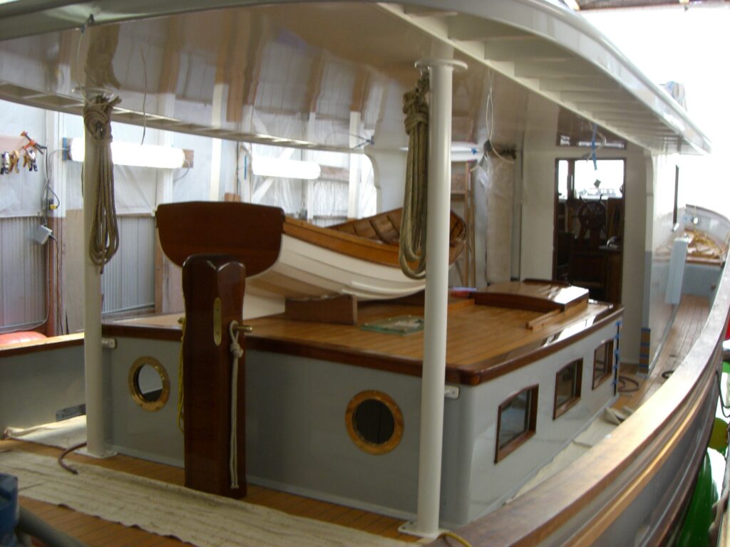 Complete disassembly of the decks, fish hold, and all systems allowed removal of the engine and transmission to a dedicated machine shop. The keel-cooled Gardner 6LW locomotive engine was rebuilt entirely with all sub-components polished….by a Gardner grandson. The fish hold was converted into a stateroom with Alaskan yellow cedar beams, mahogany, and teak touches. All tankage was replaced with custom-designed tanks, and the overhead deck was shipwright designed and replaced. The bow was redesigned to accommodate new decks, to include timber and picket reinforced gunnels. The rounded corner transom is also stave stern, a quintessential and heavy duty Wahl detail. Completely new exterior deck planks were installed and sealed. And the wood: the fine woodwork alone took over 5 years to complete and every design improvement of the boat was considered, consulted over, and implemented correctly.