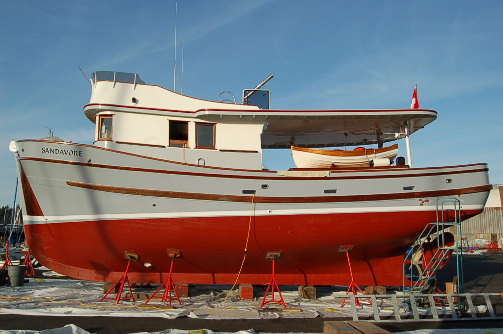 She now has a 2000nm range and over 400 gal of freshwater capacity, plus a robust bow thruster, custom-articulating paravane stabilizers, and a discreetly installed suite of electronics. Visitors will note the Ken Douglas, copper riveted lapstrake skiff that sits in her cradle above the fish hold; at the 45th Victoria Classic Boat Show I was able to confirm- from a kind family member who recognized his handiwork- that this was the final hull made by Ken before he crossed the bar. As owners, we are still humbled and open-mouthed by Sandavore, her phoenix name. Sandavore has double meaning: the Isle of Eig in the Outer Hebrides has a small, self-contained community named Sandavore, and sanding- ever more sanding- is the nature of her beautiful existence!